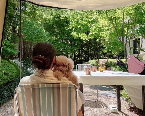写真には、野外の暖かい日差しの下でチェ・ジウが愛犬アロンを抱いて、にっこりと微笑む姿が収められている。爽やかな森林を背景にテントの中で休息を取る彼女は清純で素朴な美しさを発散。テーブル脇には、ベビーカーが置かれており、愛らしい娘の存在を伺わせた。