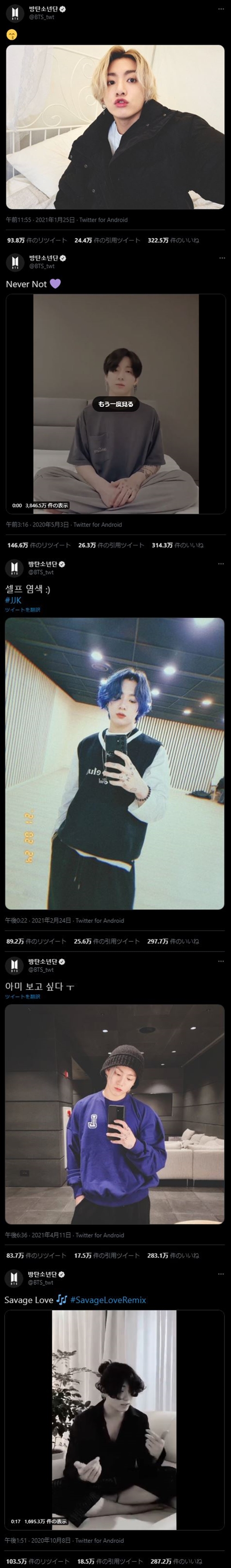 「Listofmost-likedtweets」Top30によると、7位、11位、12位、15位、17位がJUNG KOOKによるツイートだ。