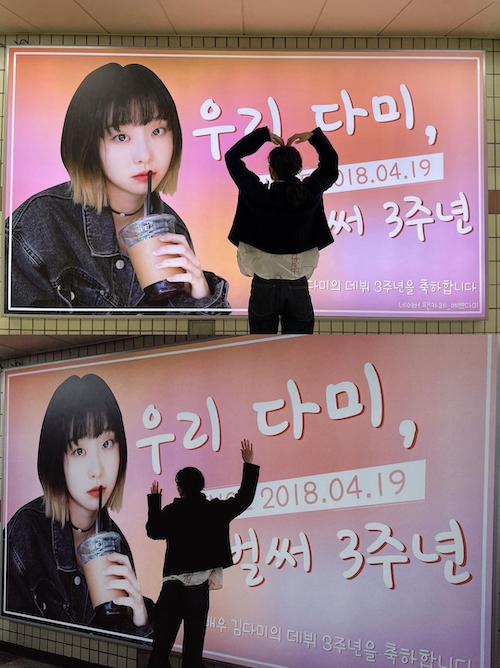 写真の中には、ファンクラブが用意したデビュー3周年記念の記念広告を実際に見に行ったキム・ダミの姿が写っている。自分の大型写真と「うちのダミ、早くも3周年」「キム・ダミのデビュー3周年おめでとうございます」という文章入りの広告の前に立ったキム・ダミは、両腕を上げてハートを作った後ろ姿で、広告を出してくれたファンに感謝の気持ちを伝えた。