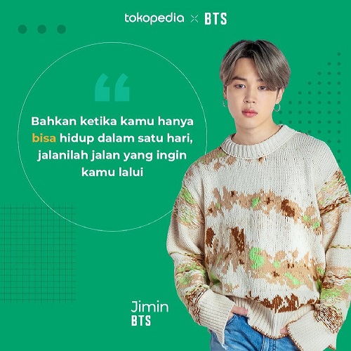 JIMINのビジュアルとメッセージを伝えたのは、インドネシア最大の電子商取引企業Tokopediaだ。Tokopediaは最近、公式ツイッターやインスタグラムを通じて、JIMINの画像とメッセージを公開した。