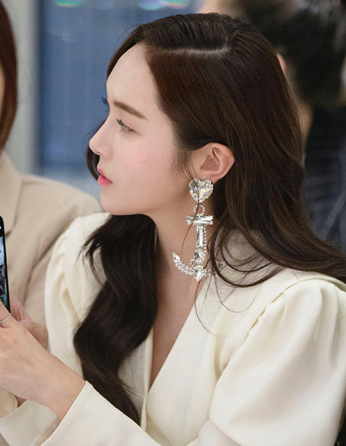 ホワイトカラーのブラウスに同系色のイヤリングを合わせて清純な魅力を披露しただけでなく、シックなスーツスタイルを基調としたオールブラックコーディネートでセクシーな印象を与えることも忘れなかった。