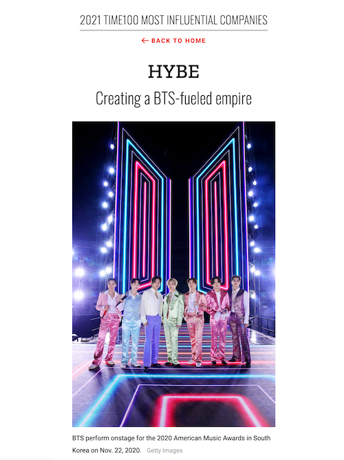 『TIME』はHYBEについて「昨年10月、韓国でここ3年以内の最大規模の企業公開があったが、韓国で最も人気のある輸出コンテンツ・K-POPに基づいたものだった。2005年に設立されたかつてHYBEは競争の激しい韓国の音楽業界においてアンダードッグ(勝つ確率の少ないチーム)だったが、現在は世界で最も人気のスーパーグループBTSに支えられ鰻上りだ」と紹介している。