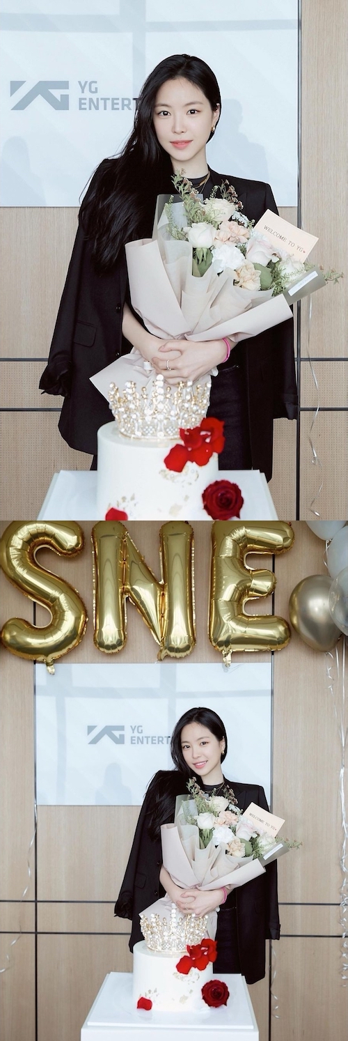 写真の中のソン・ナウンは、歓迎ケーキの後ろに立って花束を持ってポーズを取っている。Apinkでの愛くるしいイメージとはまた違うエレガントなオーラが印象的だ。