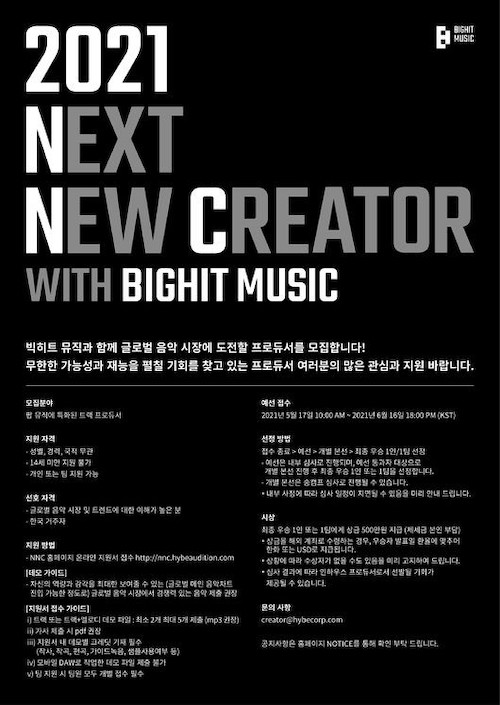 BIGHIT MUSICEは5月13日、「NNC(Next New Creator)プロジェクト」の公式ホームページを通じて共にグローバル音楽市場に挑戦するプロデューサー発掘するプロジェクト「2021 Next New Creator with BIGHIT MUSIC」開催を知らせた。