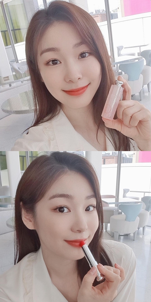 写真の中のキム・ヨナは、白のトップスやナチュラルなヘアスタイルで鮮やかな赤いリップを際立たせている。リップを塗るという日常の中で魅せる何気ない仕草であるだけに、自然体ならではの美しさが際立つ仕上がりだ。