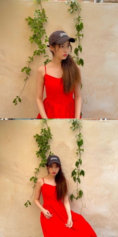 公開された写真のIUは、真っ赤なドレスに黒い野球帽というスタイル。28歳とは思えない若々しさと抜群のスタイルが目立った。
