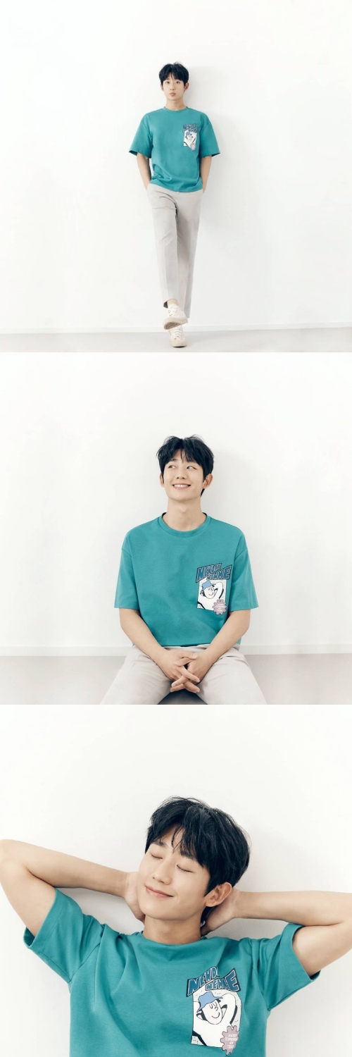 公開された写真には、無邪気な表情を浮かべるチョン・ヘインの姿が写っている。グリーンのTシャツにグレーのパンツを合わせた涼しげなスタイルのチョン・ヘインは、Tシャツのイラストの表情を真似るなどお茶目な魅力を発散した。