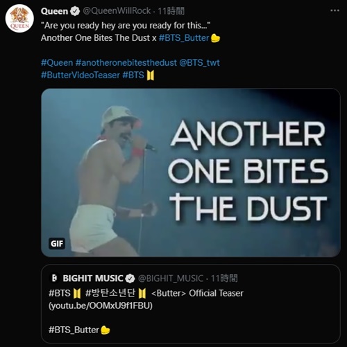 QUEENは「“Are you ready hey are you ready for this”」(準備できたか)という言葉とともに、「Another One Bites The Dust × #BTS_Butter」という文を掲載。