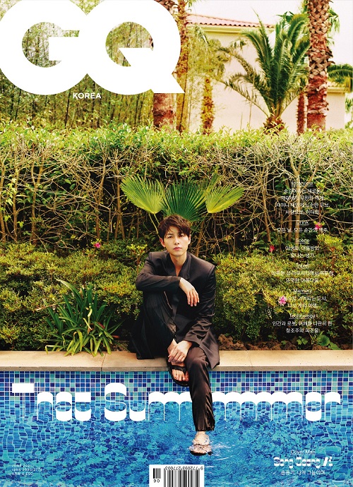 今回公開されたカバー写真には、Dior(ディオール)メンズラインのブラックセットアップとビーチサンダルという夏を思わせるスタイルで、プールサイドでたたずむソン・ジュンギの姿が。背後の緑とプールの青が涼やかさを演出している。
