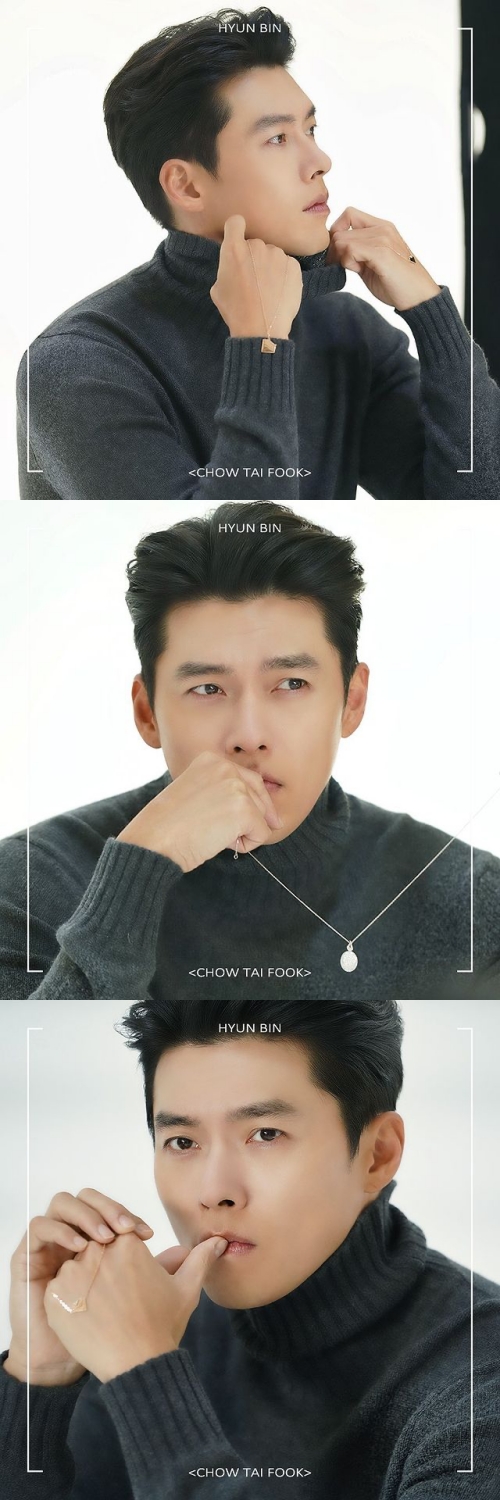 写真の中のヒョンビンは、さまざまなデザインのネックレスを手にしながら真剣な表情でカメラを見つめている。多彩な表情で見る者の目を引く。