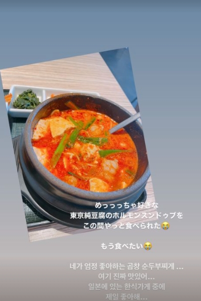 さらに最近、ストーリー機能で「めっちゃ好きなホルモンスンドゥブをこの間やっと食べられた。もう食べたい」という書き込みとともに1枚の写真を公開した。