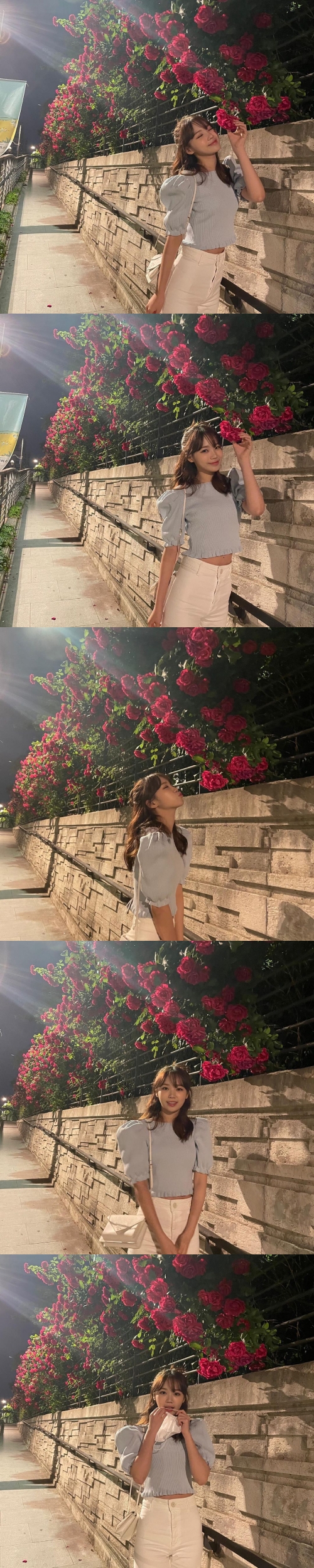 公開された写真のキム・チェウォンはバラの花の下でポーズを取っている。魅力的な笑顔が眩しい。ブルーのパフスリーブトップスに白のパンツを合わせ、爽やかでキュートなビジュアルを披露した。