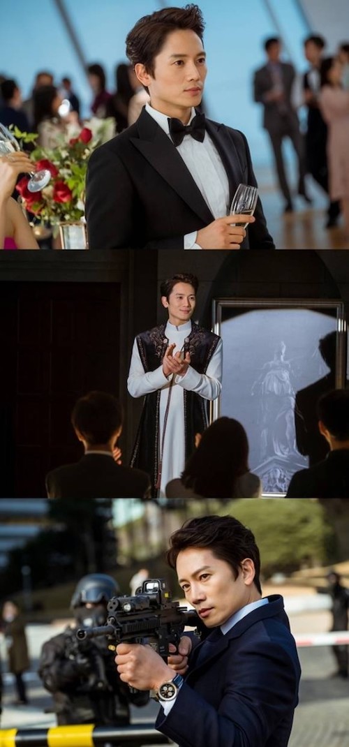 新しく公開された場面写真の中でも、一般的な判事とは違うチソンの様子が目を引く。黒いスーツを着てシャンパングラスを持つ姿や、法服を着て優しく微笑む姿、銃を持ってどこかを狙っている姿は、彼の正体について疑問を膨らませる。