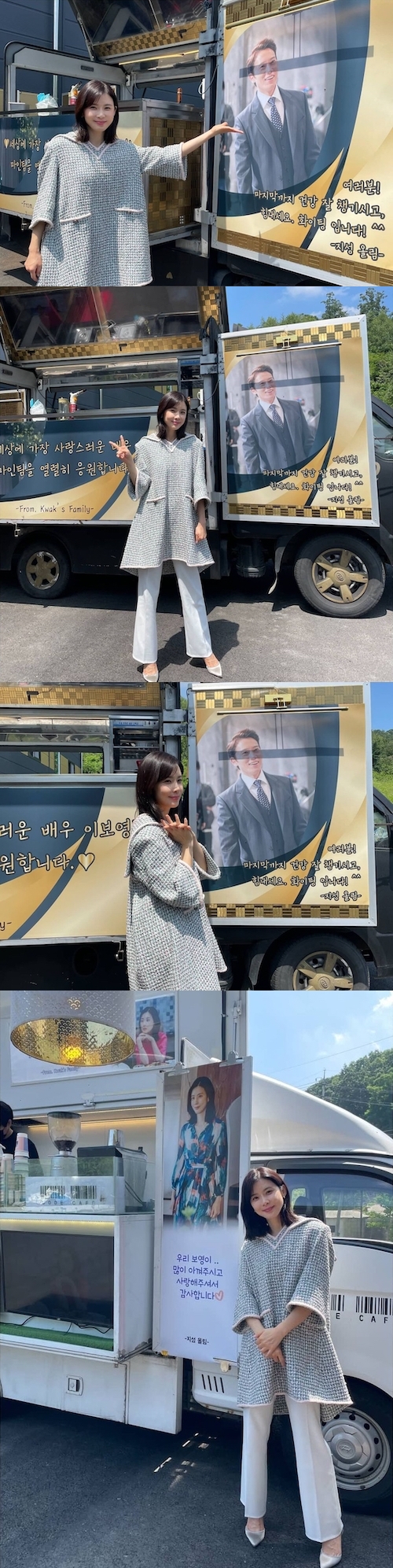 写真の中のイ・ボヨンは、チソンの写真入りトラックの前で笑顔を浮かびながらポーズをとっている。夫からの応援に喜びを隠せない可愛らしい姿ながらも、ドラマの中の上品な雰囲気をしっかりと漂わせているのが印象的だ。