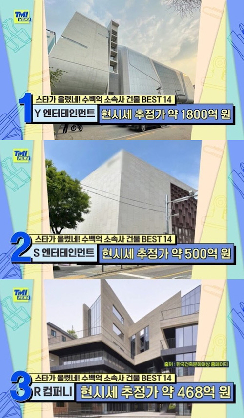6月9日に放送されたMnetの『TMI News』では、「スターが建てた、数百億の所属事務所のビルBEST 14」が公開された。