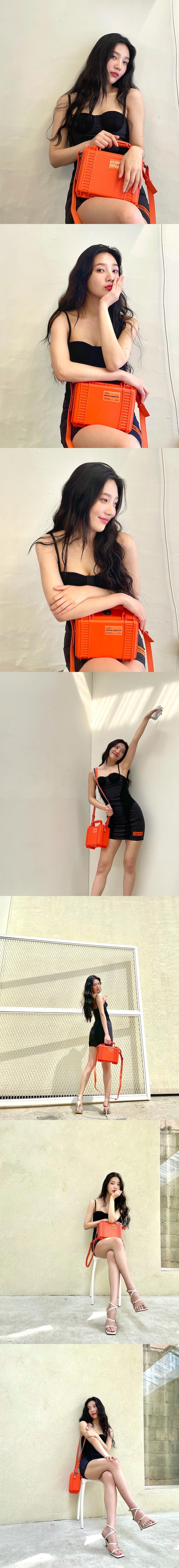 写真の中に写ったジョイは、黒のミニワンピースにオレンジ色のバッグを合わせた爽やかな夏コーデを披露している。