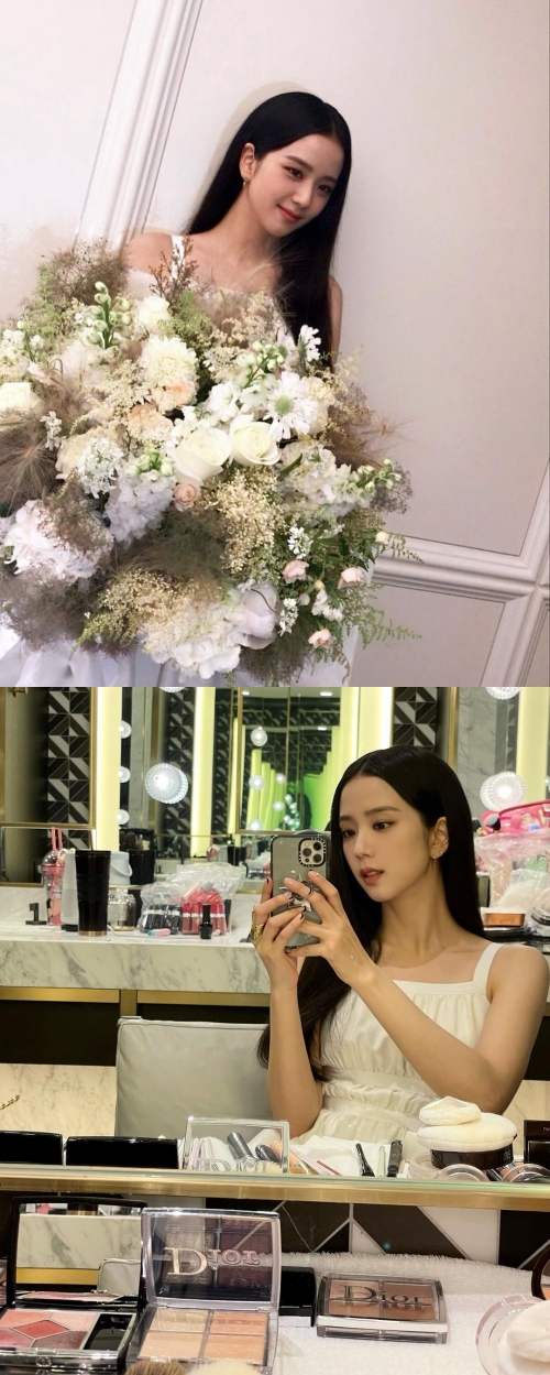 別の写真では、メイク室の鏡で自撮りをするジスの姿が写っている。ジスはホワイトワンピースに華奢なアクセサリーを合わせ、優雅な雰囲気を纏っている。彼女独自の“清純美”がファンを圧倒した。