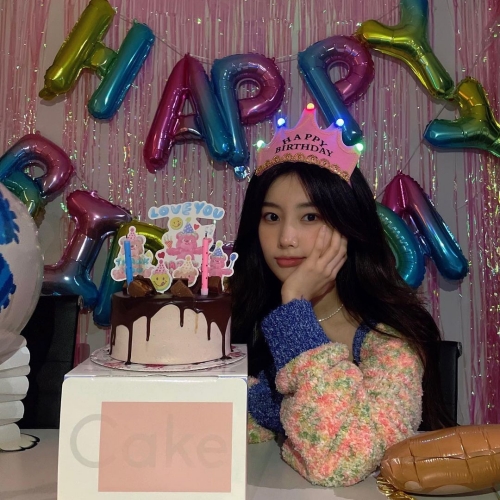 投稿された写真でカン・ヘウォンは、バースデーバルーンが飾られた壁の前で、頬杖をついて微笑んでいる。目の前にはバースデーケーキが置かれている。