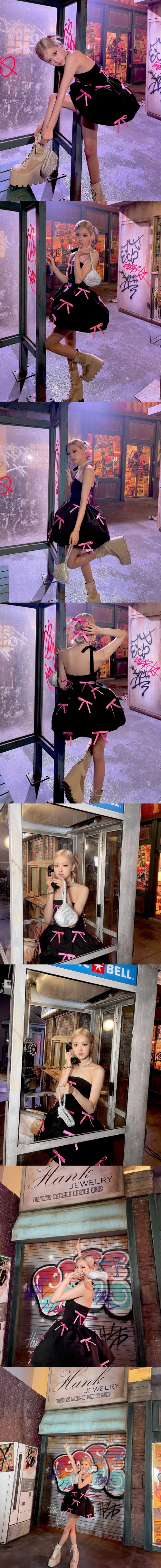 投稿された写真には、ピンクのリボンが大量に施されたベアトップドレスを着用しているロゼの姿が写っている。厚底のチャンキーブーツを合わせた個性的なスタイリングを披露したロゼ、細長い手足が目を引く。
