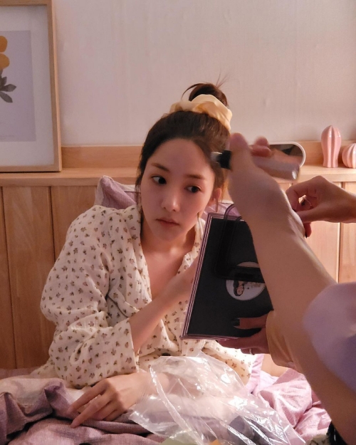 公開された写真には、撮影の合間に化粧直しをするパク・ミニョンの姿が写っている。