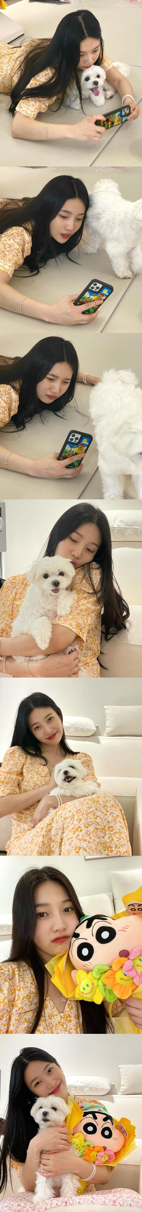 写真の中のジョイは、愛犬ヘン二ムとの撮影会を楽しんでいる。黄色い花柄のワンピース姿というキュートな装いも印象的だ。