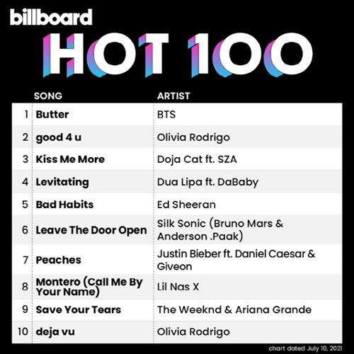 その『Butter』が収録された実CDが7月9日に発売されただけに、ビルボードの長期覇権は当分続く見通しだ。また同CDに収録されている新曲『Permission to Dance』は、2019年の楽曲『Make It Right』を共同制作したEd Sheeran(エド・シーラン)が再び参加していることでも話題を集めている。