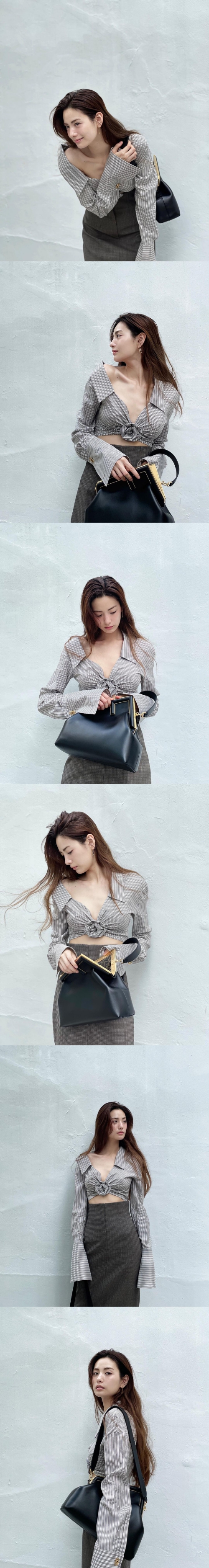 投稿された写真でナナは、ポーズをとってカメラを見つめている。胸元が大きく開いたストライプシャツで美しい鎖骨をアピールした。グレーのスカートとレザーのバッグというシックなアイテムもしっかりと着こなしている。