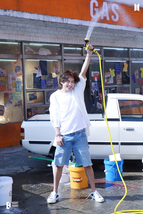掲載された写真には、ニューシングル『Butter』のコンセプトビジュアルを撮影するVのオフショットが写っている。