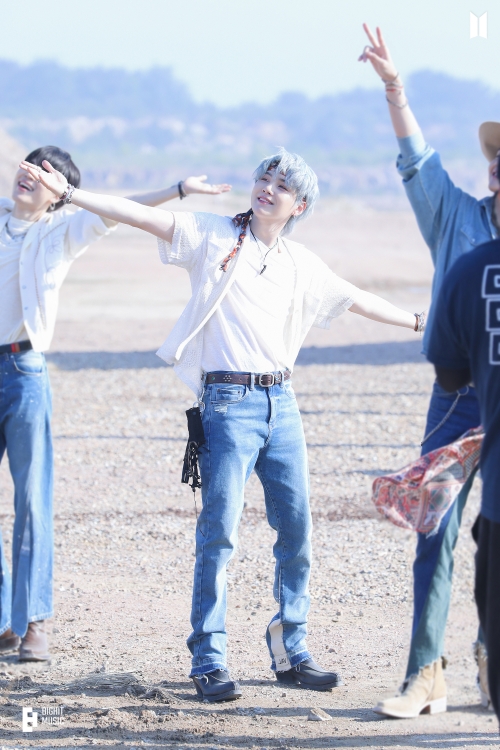 掲載された写真には、ニューシングル『Butter』のコンセプトビジュアルや新曲『Permission to Dance』のミュージックビデオを撮影するSUGAのオフショットが写っている。