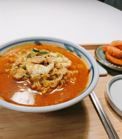 投稿された写真には、画面いっぱいにチョン・ミドが作ったラーメンが写っている。