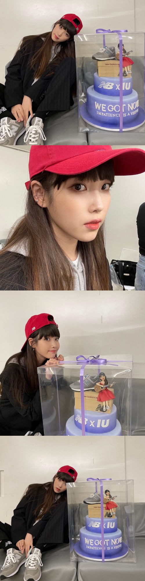 投稿された写真には、ソファーに腰掛けるIUの姿が写っている。赤いキャップに黒いスーツを合わせたボーイッシュなIUの装い。前髪のせいか、どこかあどけない彼女の姿が世界のファンを虜にしている。