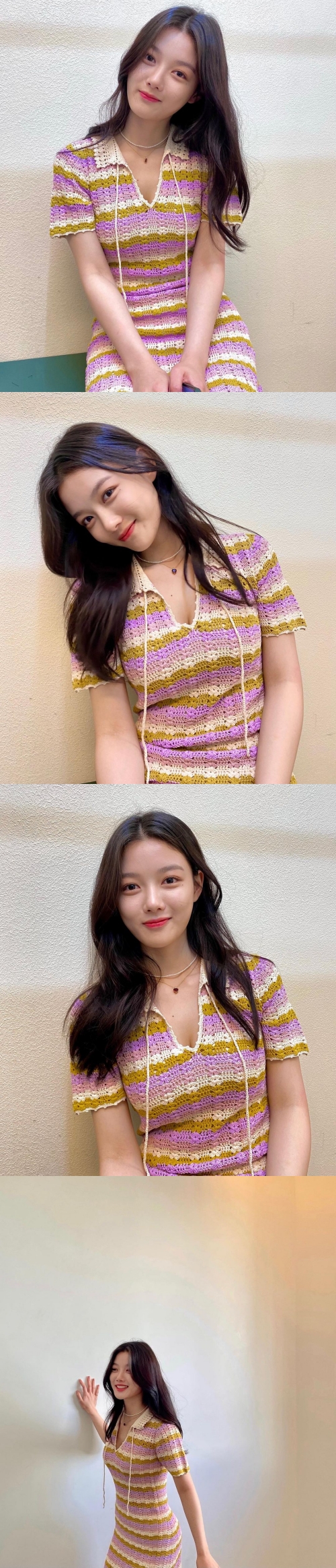 ボーダー柄のかぎ編みワンピがキム・ユジョンの可愛い魅力をより一層高めた。