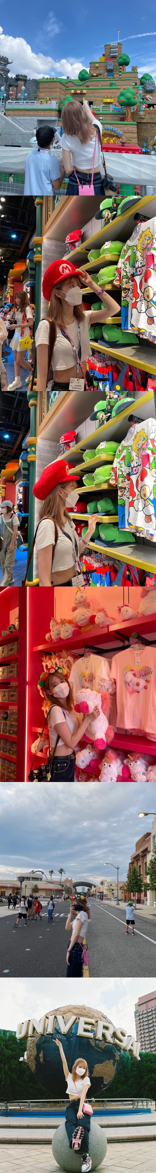 クロップドTシャツにジーンズ、頭にはUSJのカチューシャをかぶり、楽しんでいる様子だ。