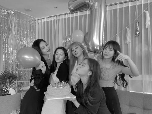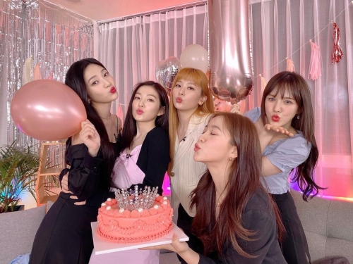 投稿された写真には、ケーキの前で口をすぼめながらキュートなキス顔を披露するRed Velvetのメンバーたちが写っている。