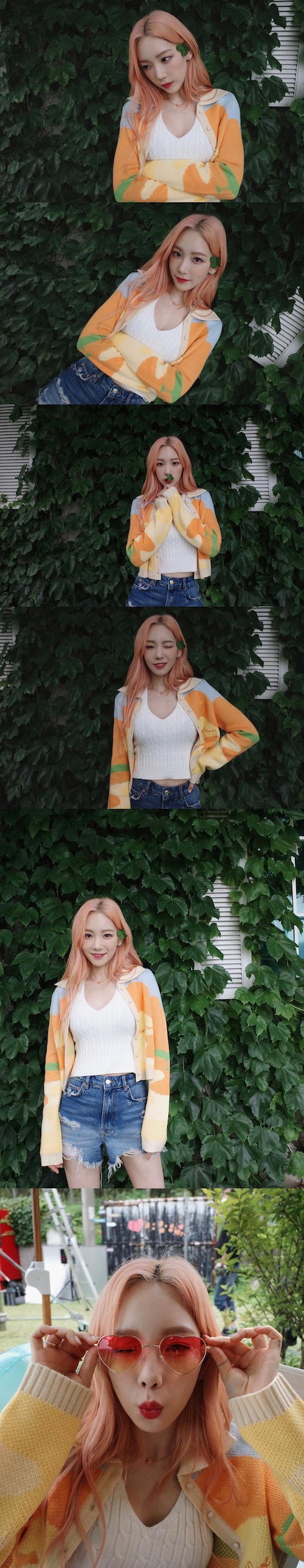 写真の中のテヨンは、カジュアルなリブニットにデニムのショートパンツを着用し、ツタの前でさまざまなポーズを取っている。ピンク色の髪の毛と色白美肌が華やかさを引き立たせ、ファンのハートを震わせた。