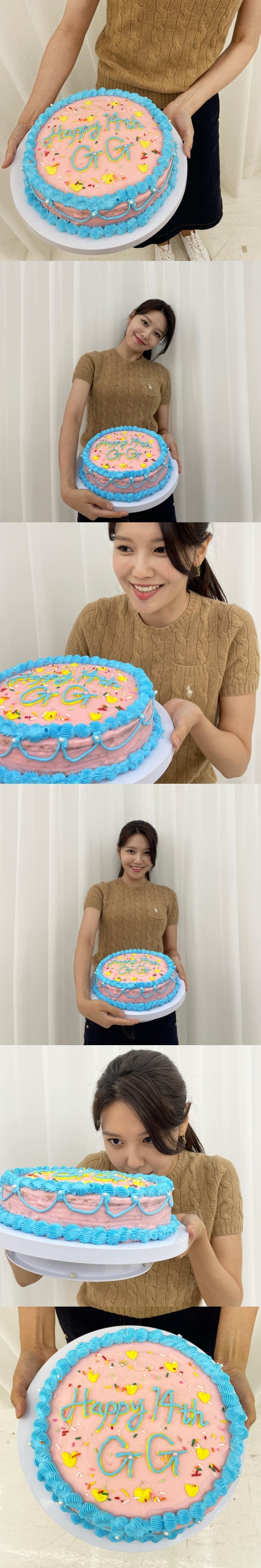 スヨンはキャメル色のサマーニットに黒のスカートという、シンプルながらも洗練された装い。「Happy 14th GG(Girls Generation)」と文字が入ったカラフルなケーキを、大事そうに抱えている。