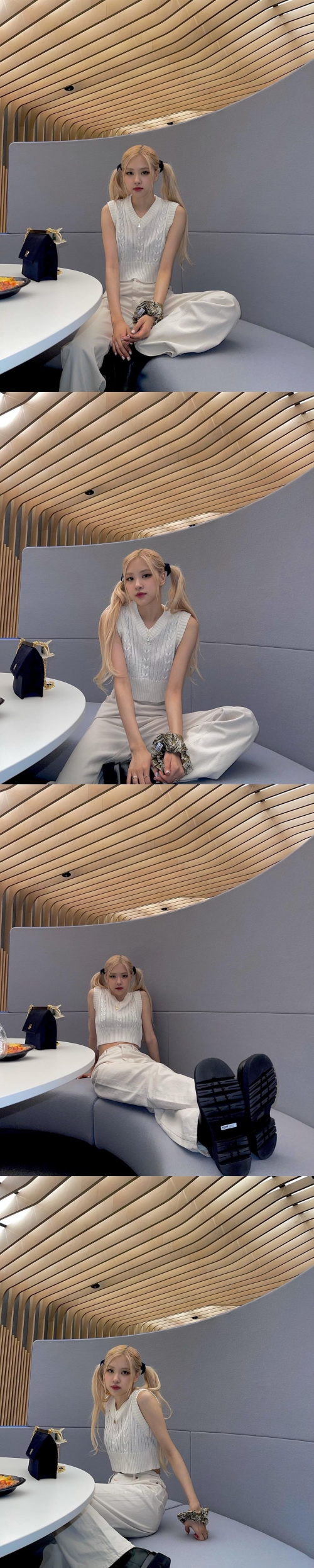 さらにロゼは同日、「同じ日、違う格好+チリチーズフライ」と綴りながら4枚の写真を投稿。先ほどと同様にツインテール姿だが、白で統一されたサマーニットとジーンズ、黒のブーツというモードなスタイルに着替えている。