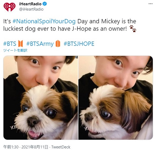 アメリカ最大のラジオ放送局iHeartRadioは、8月10日の「愛犬の日」(National Spoil Your Dog Day)を迎え、公式ツイッターにJ-JOPEとミッキーが一緒にいる写真を投稿した。