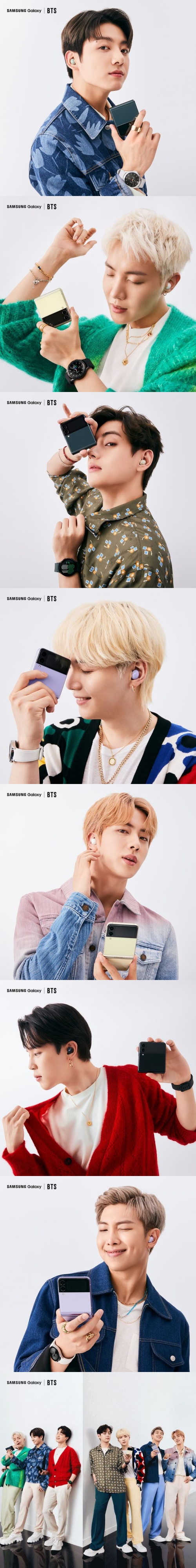 公開されたビジュアルには、BTSのメンバーが折りたたみ式スマートフォン「Galaxy Z Flip3」を見せながら、各々の魅力を発散させている。