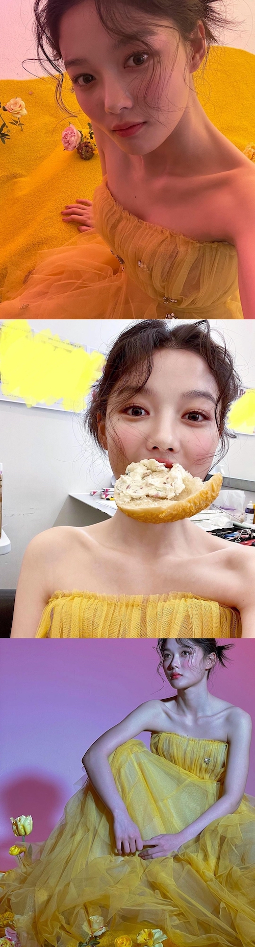 チューリップを連想させる黄色いチューブトップドレスに身を包んだキム・ユジョンは、清楚で爽やかな雰囲気を醸し出している。