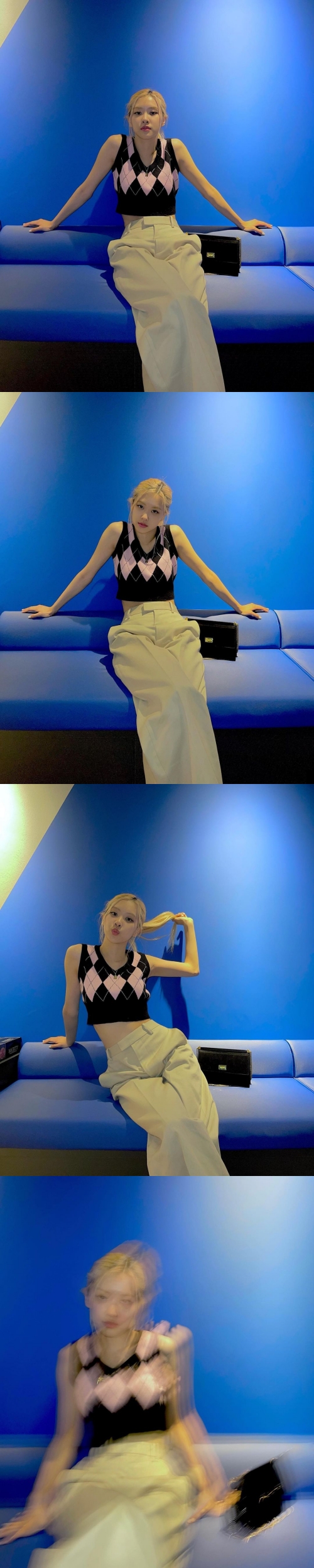 アップされた写真には、青いソファーに腰掛けるロゼの姿が。ファインダーをしっかりと見つめ、余裕が感じられる堂々とした態度だ。