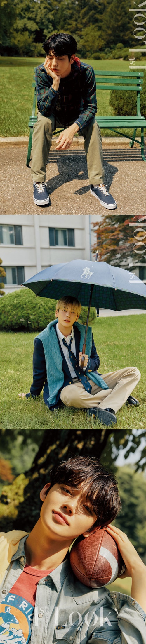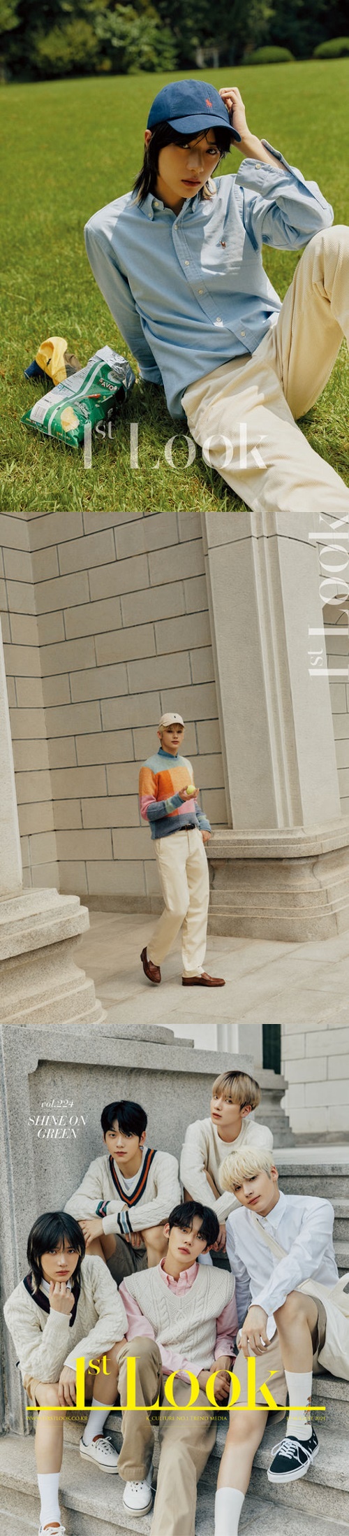 今回の『1st Look』のグラビアには、キャンパスで自由に時間を過ごすTXTメンバーの多様な姿が込められている。自転車やボード、ラグビーボールと一緒にした活動的なカットのメンバーたちは、アメリカンクラシックファッションを完璧に消化した。