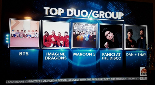 BTSは「Top Duo/Group」と「Top Social Artist」の2部門で候補に挙がった。BTSが候補に挙げられるのは今回で3回目となるが、「Top Duo/Group」部門に選ばれたのは初めてだ。この部門にはBTSの他にImagine Dragons、Maroon 5、Panic! At The Disco、Dan+Shayといった世界的なアーティストが名を連ねている。