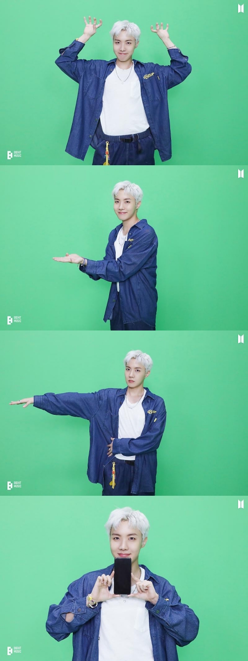 怪獣のように両手を構えた“がおーポーズ”や、片手を広げたポーズなどでファンのハートを鷲掴みにしているJ-HOPE。ホワイトブロンドに光る髪もJ-HOPEの顔を明るく見せている。