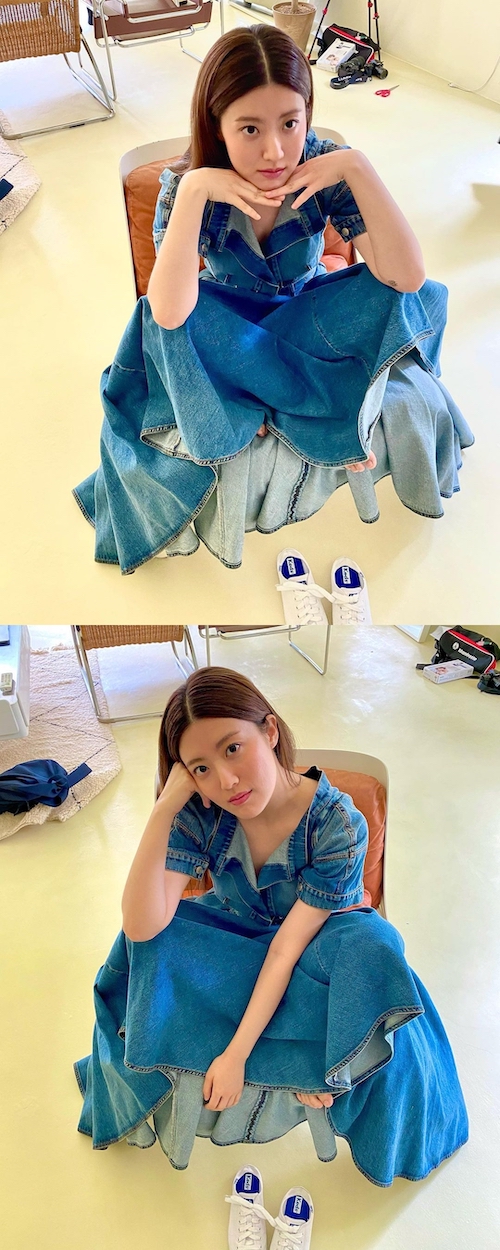 デニム素材のワンピースを着て楽な姿勢で座ったナム・ジヒョンは、両手を顎に当てた可愛らしいポーズや、カメラ目線で何気ない表情を披露している。女子大生のお手本のような、その爽やかな美しさは圧巻だ。