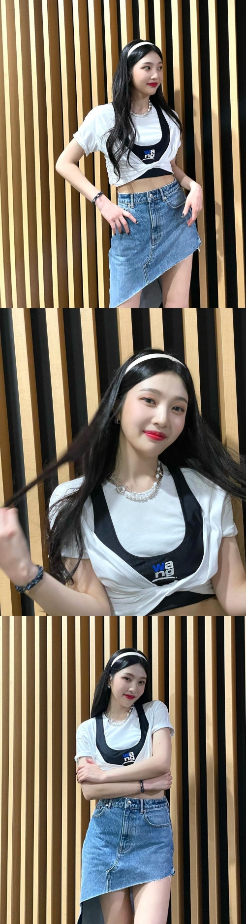 何より目を引くのは、デニムスカート。斜めにカットされており、ジョイの白い美脚が露出している。