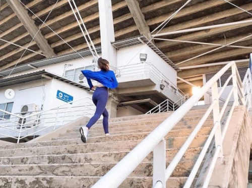 白いジャージとレギンスを着たナヨンは、飲料を持って爽やかな笑顔を見せたり、階段を走り登ったりしている。