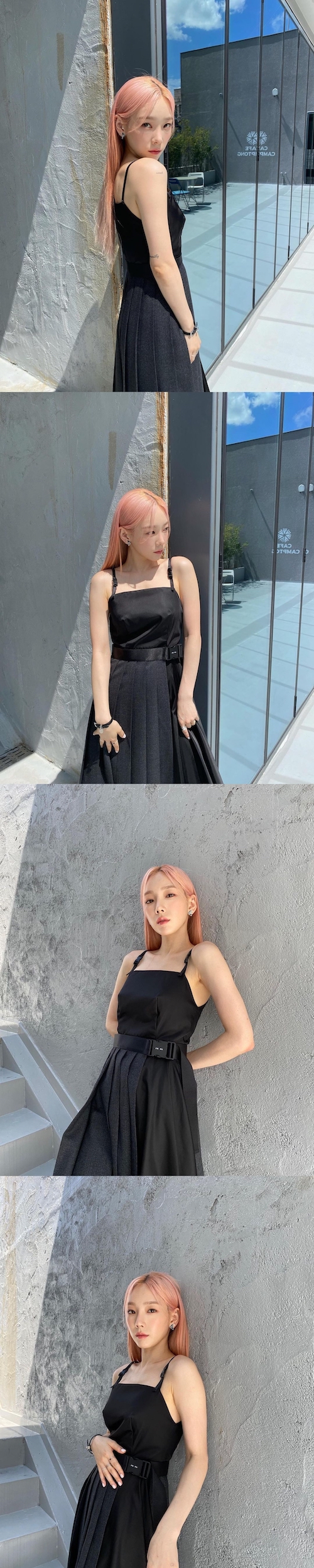 写真の中には、黒いワンピースを着たテヨンがスタイルの良さと美貌を見せつけている。