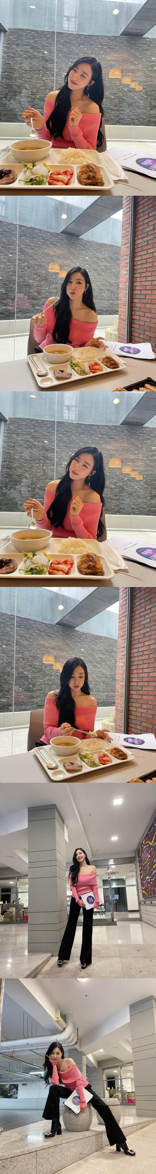 ティファニーはピンクのオフショルダーニットを着用し白く華奢な肩をのぞかせた。全身を写したショットでは、長く美しい脚線が目を引く。