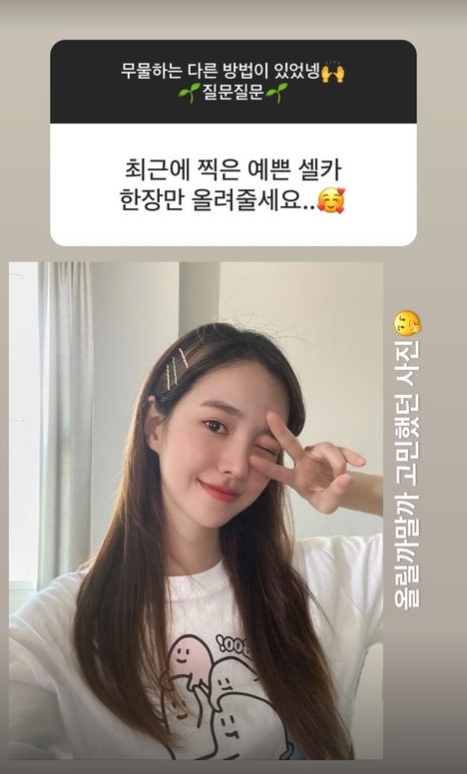 チン・セヨンは9月7日、自身のインスタグラムのストーリー機能を通じて、質問コーナーを設けている。あるファンの「最近撮った可愛い自撮り写真1枚だけアップして」という要望に「アップするか迷った写真」と1枚の写真を投稿しながら応えた。